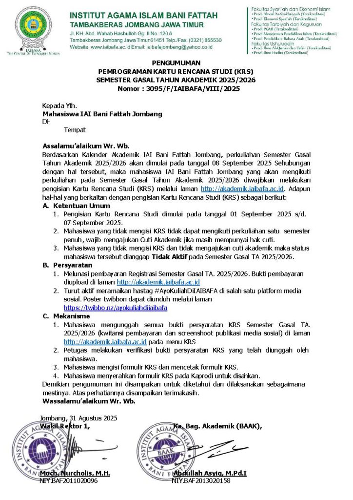 Berdasarkan Kalender Akademik IAI Bani Fattah Jombang, perkuliahan Semester Gasal Tahun Akademik 2025/2026 akan dimulai pada tanggal 08 September 2025 Sehubungan dengan hal tersebut, maka mahasiswa IAI Bani Fattah Jombang yang akan mengikuti perkuliahan pada Semester Gasal Tahun Akademik 2025/2026 diwajibkan melakukan pengisian Kartu Rencana Studi (KRS) melalui laman https://iaibafa.ac.id/new_akademik. Adapun hal-hal yang berkaitan dengan […]